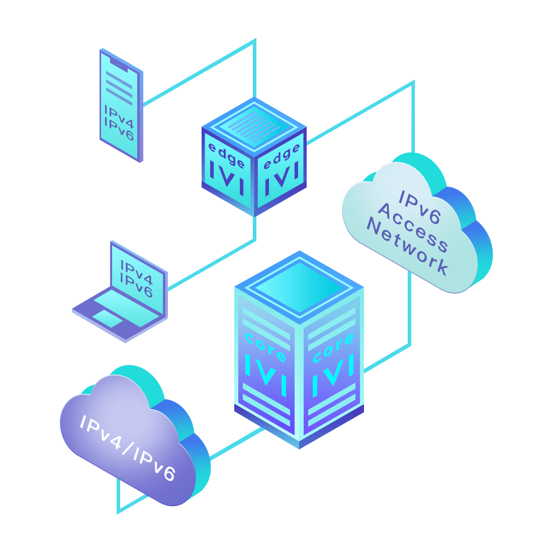 對(duì)正在進(jìn)行IPv6整體升級(jí)規(guī)劃的運(yùn)營(yíng)商,應(yīng)用IPv6升級(jí)方案2.5,通過IVI無狀態(tài)翻譯技術(shù)和純IPv6接入網(wǎng)絡(luò),為雙??蛻舳撕碗p棧服務(wù)器提供連通服務(wù)。